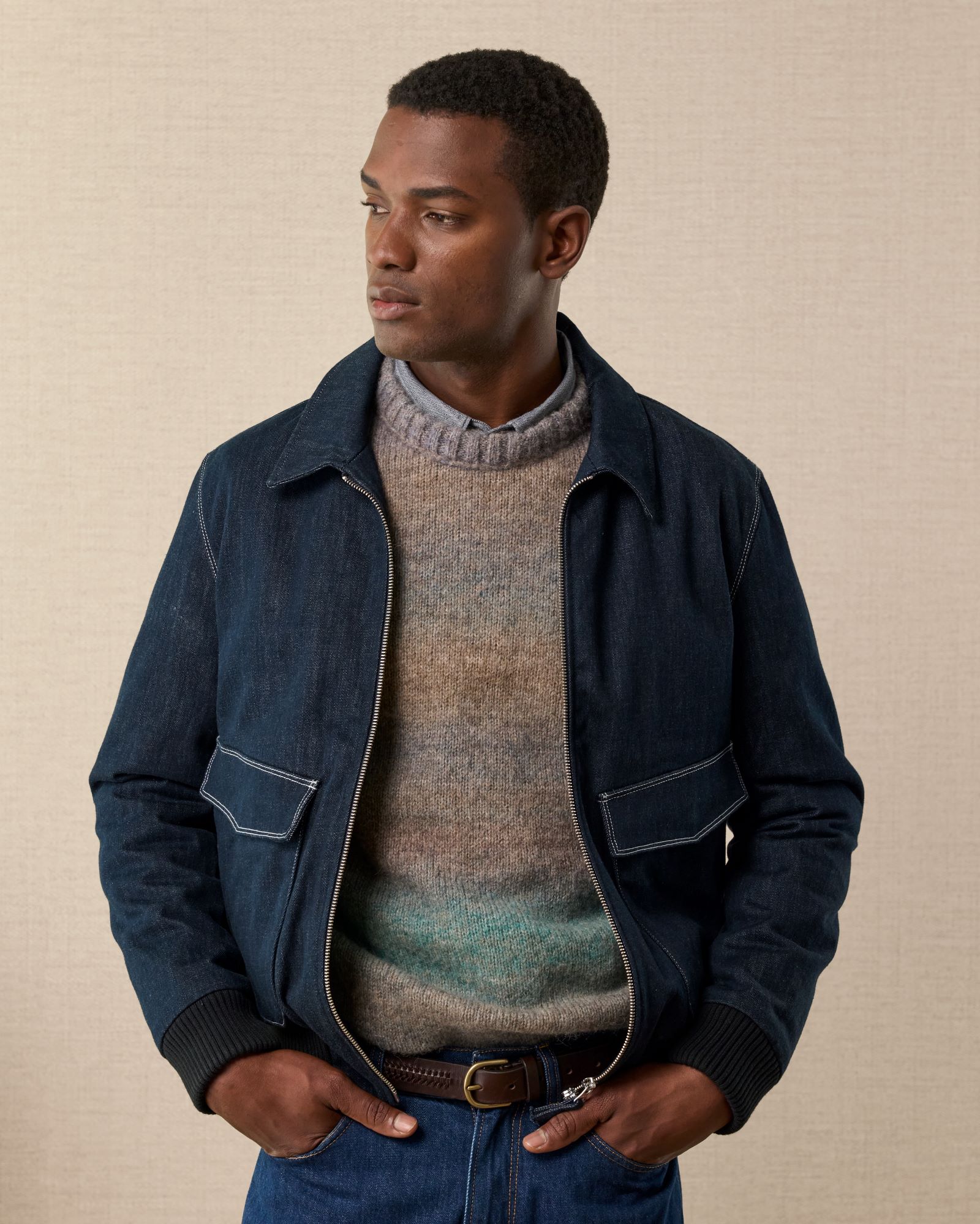 The jacket includes two generous patch pockets on the front, which were added after the garment was constructed and feature hidden snap buttons. White thread topstitching along the seams enhances the jacket’s durability and highlights the contrasting elements. The zipper is made of galvanized aged brass, providing both a delicate look and lasting strength. Additionally, the selvedge is visible on the inner seams of the yoke.
