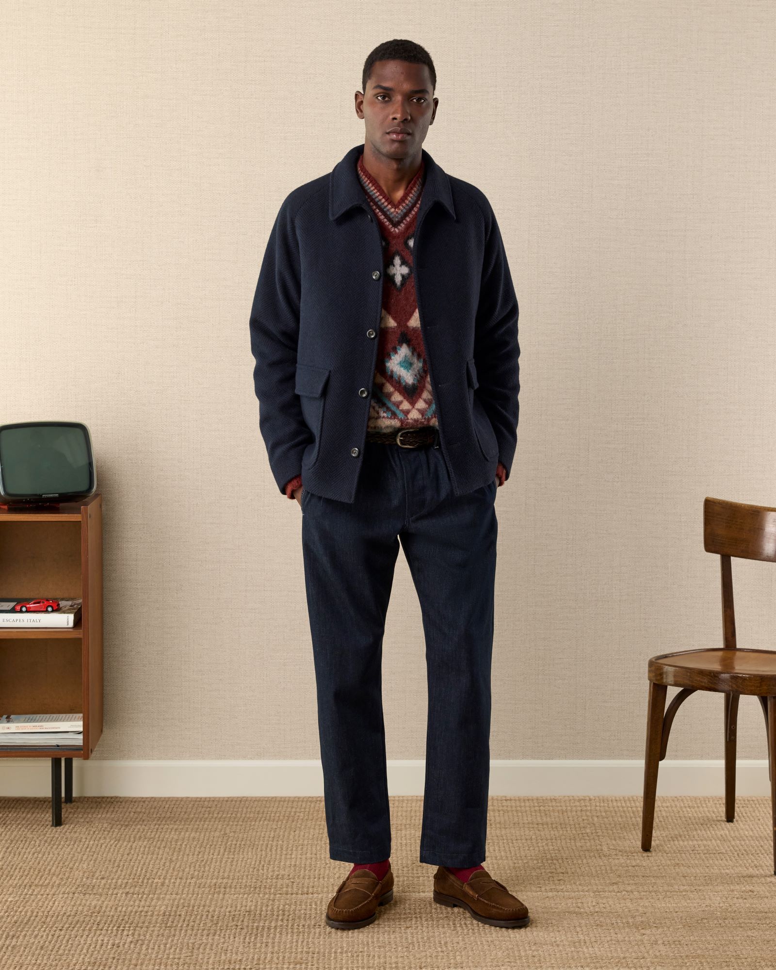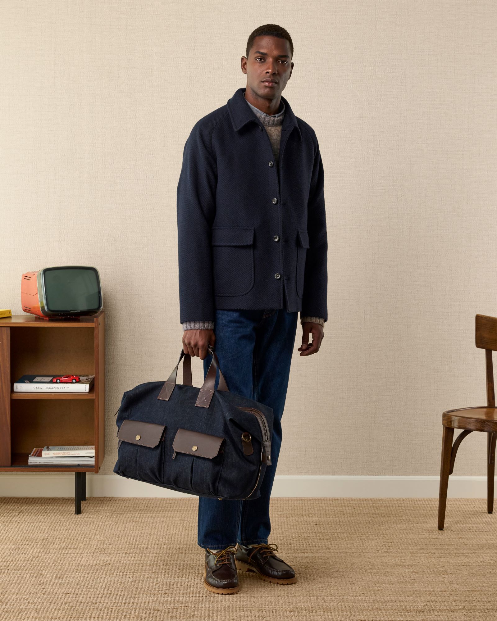 The new Alberto Candiani x Velasca capsule collection features three products: a jacket, pants, and a bag. Each item is crafted from the exclusive fabric that is also available at our micro-factory, where you can design your own made-to-measure Velasca’s Millesimo.