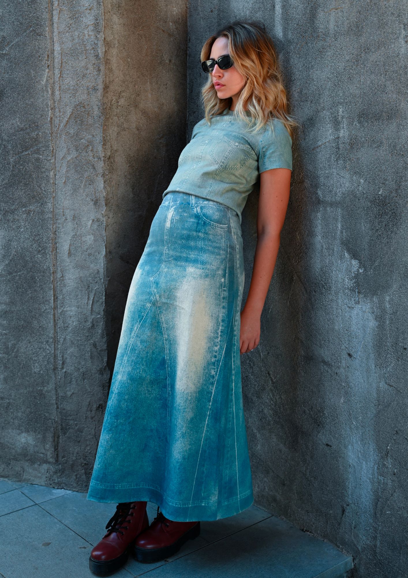 The collection is anchored by denim that has been creatively manipulated using a manual printing technique known as cyanotype. This technique harnesses sunlight to produce captivating trompe-l'œil illusory effects. The fabric is carefully treated with potassium ferrocyanide and ammonium ferric citrate and left to dry before light exposure. Objects intended to be immortalized on the fabric are strategically placed on top, allowing the solvents to react to UV rays and produce a striking blueprint.