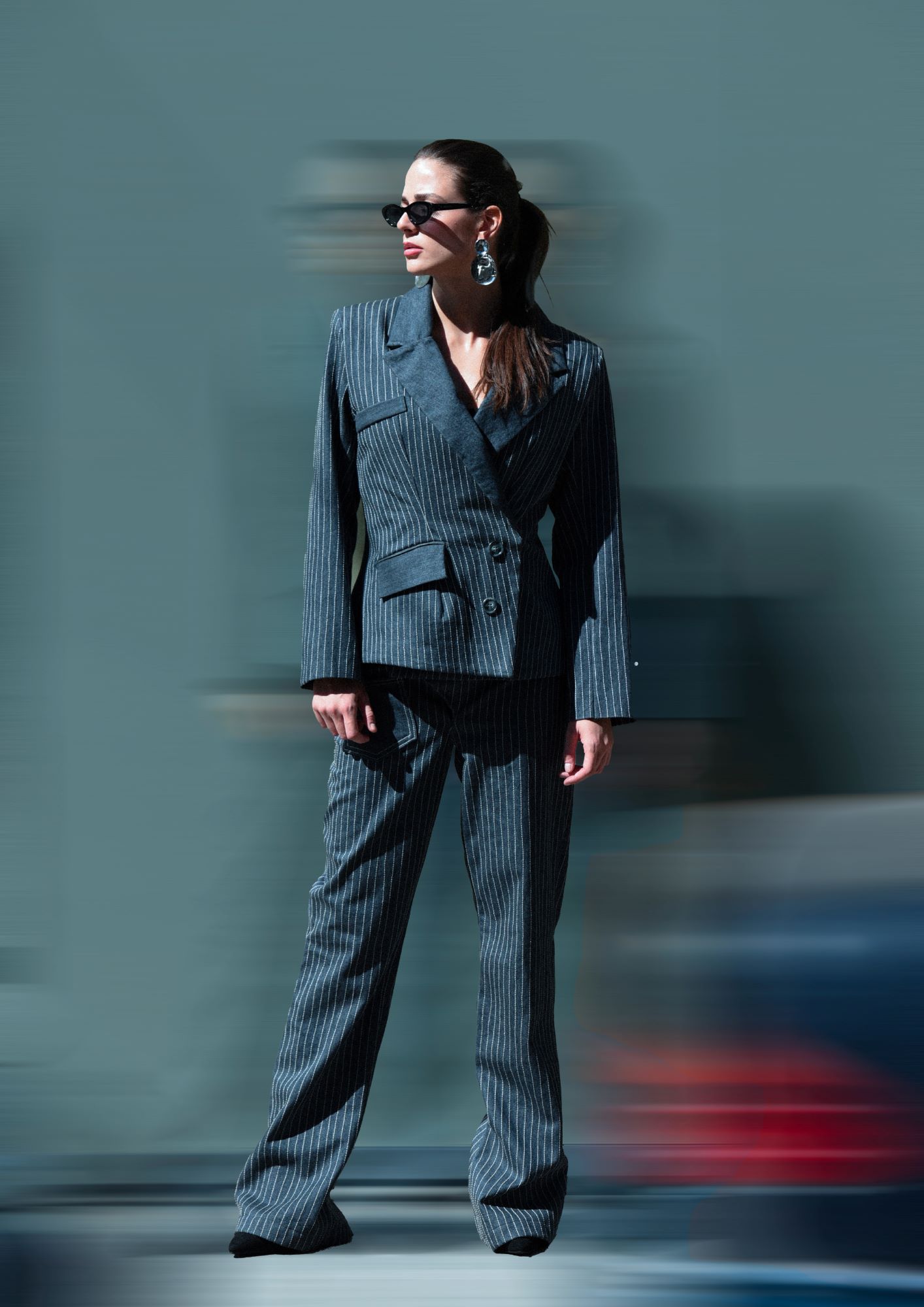 The collection comprises various pieces of clothing. The suit was created with a series of stitches spaced one centimeter apart to achieve a pinstriped effect. The thread used for the suit is reminiscent of the thread traditionally used in jeans packaging.