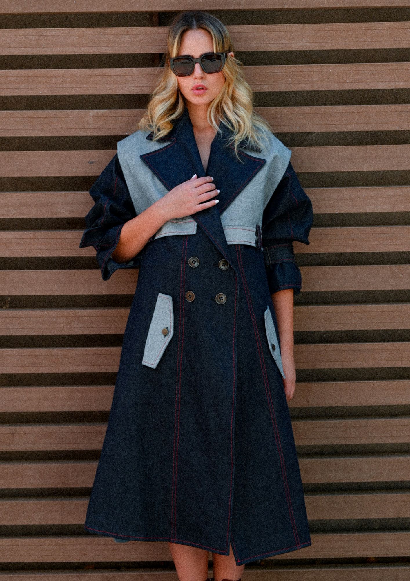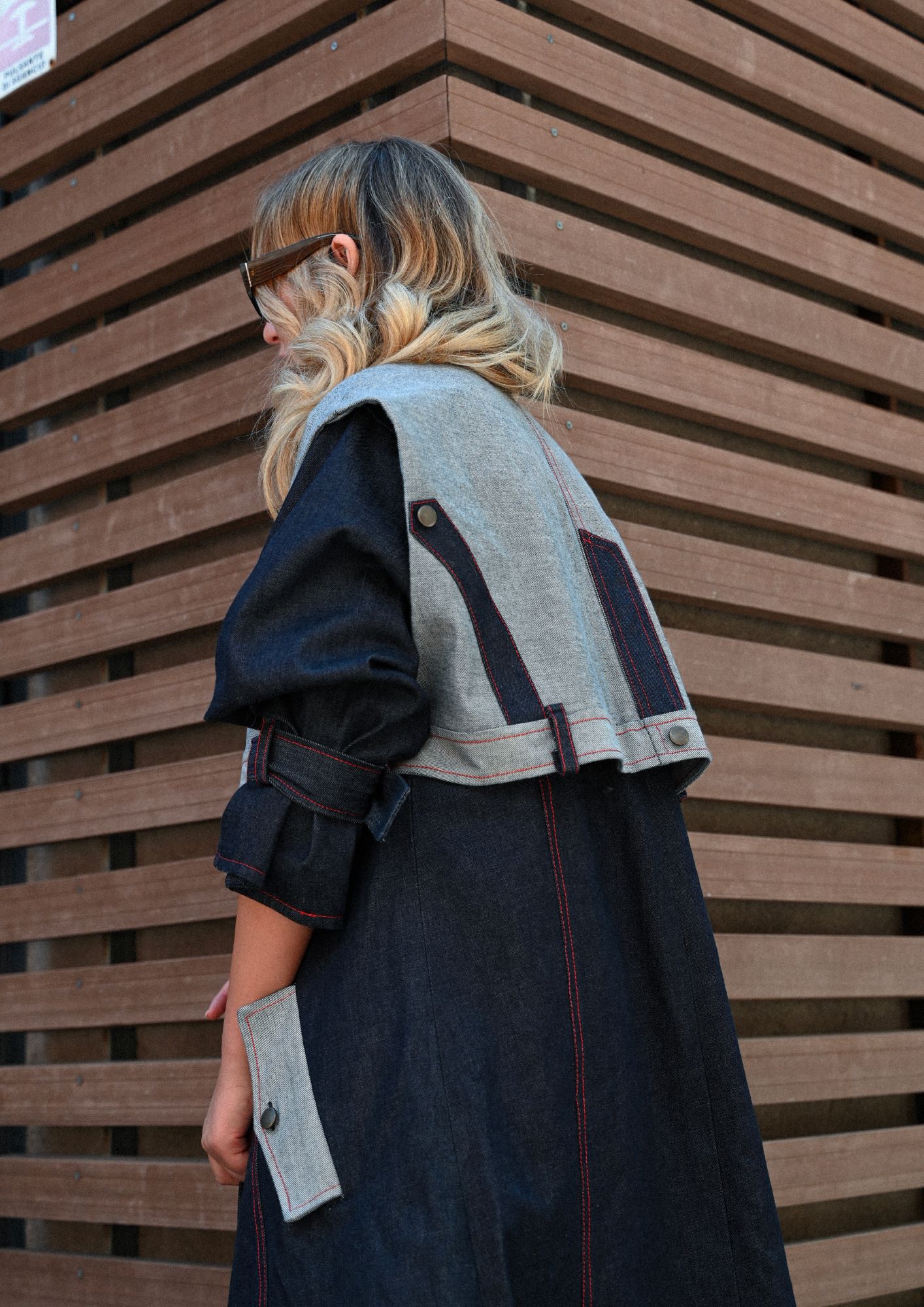The other garments were developed by transforming the characteristics of the original garment, which was jeans. These characteristics are reflected in the trench coat’s cape and the bomber jacket’s cuts. Additionally, the dress highlights a shirt collar and features asymmetrical buttoning.