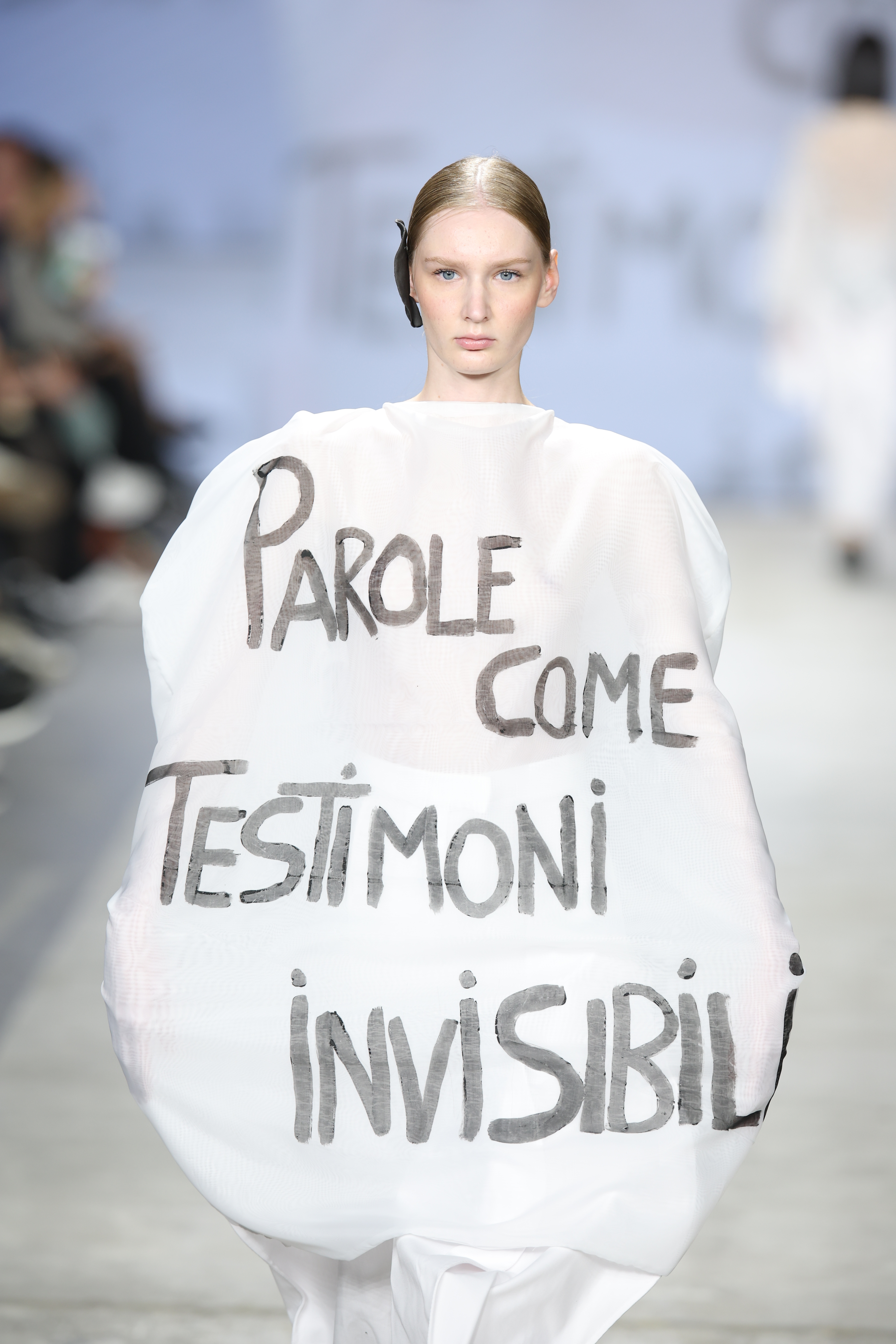 Margherita Aureli wants to create a reaction and destabilize watchers with her women’s capsule. The designer chose unusual and atypical subjects and started from their projections and their relationship with them. Her idea is that we are unwillingly attracted by undefined, peculiar, and anonymous things; hence, real elements dematerialize and become feelings and movements. This sensorial path ends with the different perceptions that integrate and interact to create a dynamic vision of reality.