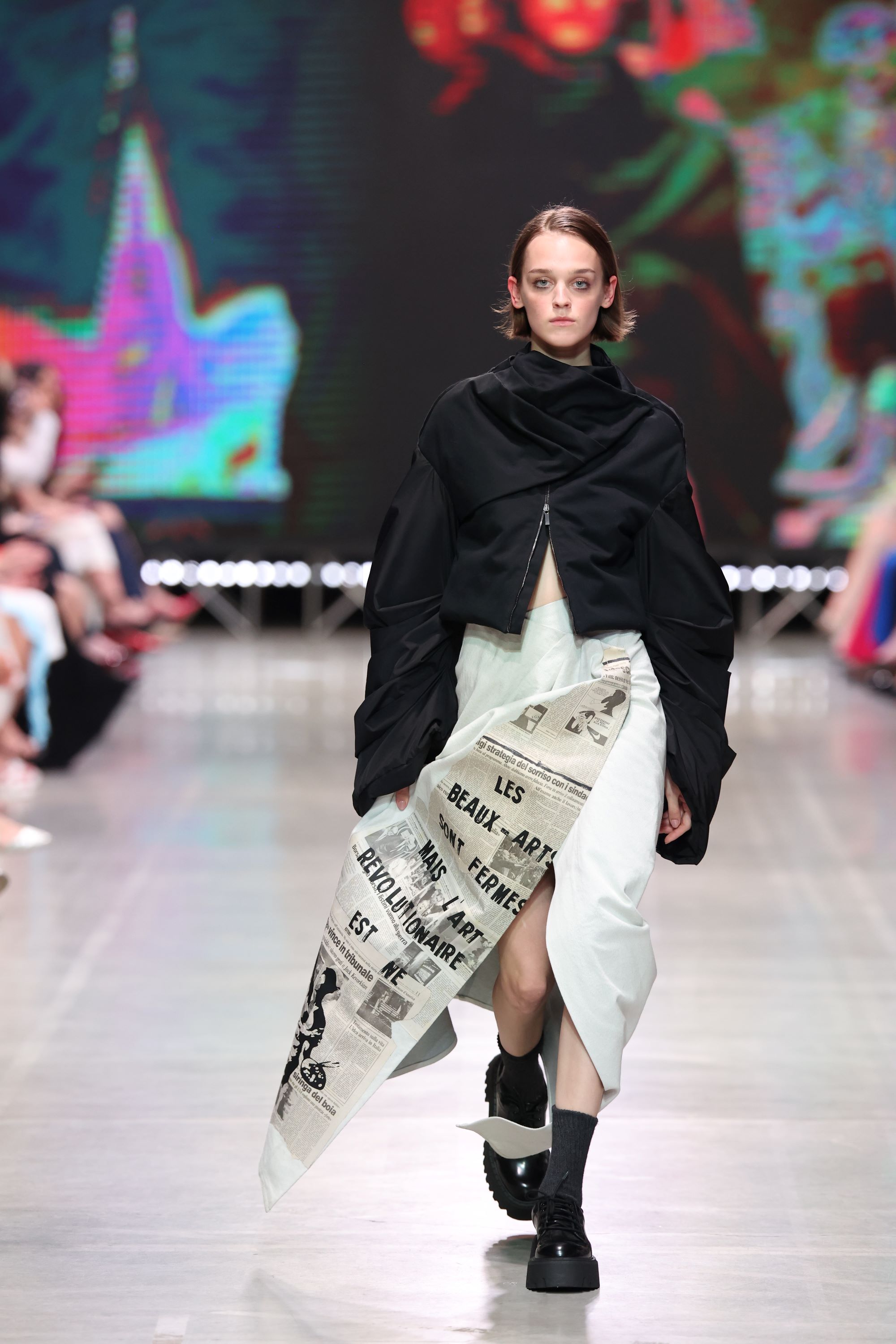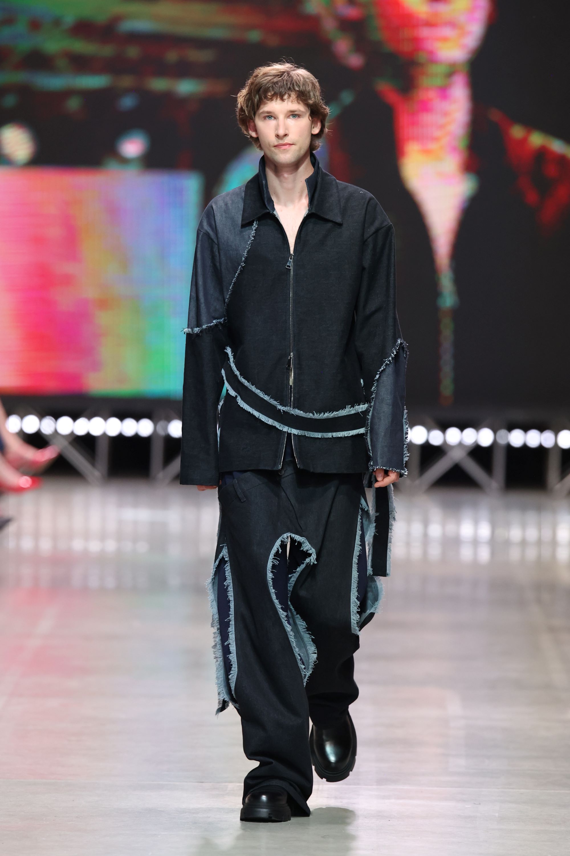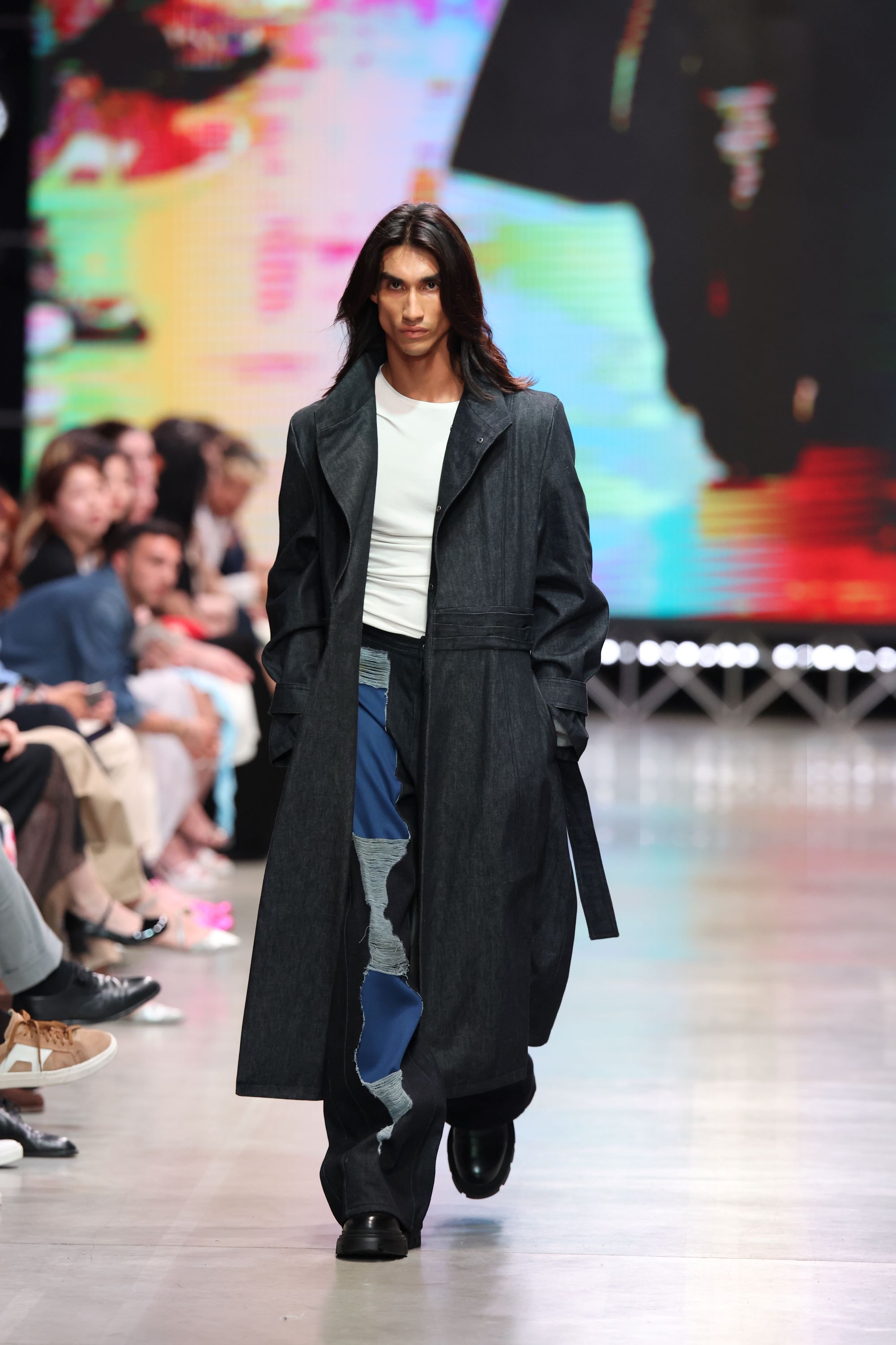 Il muro di Berlino, developed by Yujin Lee, Simone Cairoli, Thomas Carlini, Emanuele Moda, and Lorenzo Spagnolo in collaboration with Candiani Denim, focuses on the famous barrier. The Berlin Wall is both the subject and the starting point and is demystified within the context of the collection. Despite various attempts to overcome and break down the wall over the years, they have been unsuccessful, and the barrier has taken on historical and artistic value. The men’s collection represents the symbolic value assumed by the wall. It is characterized by dualism, and its identity appears brutal and melancholic but also energetic, subversive, and instinctive. Cairoli won the Candiani Denim prize for his work, which consists of a supply of fabric for his creations.