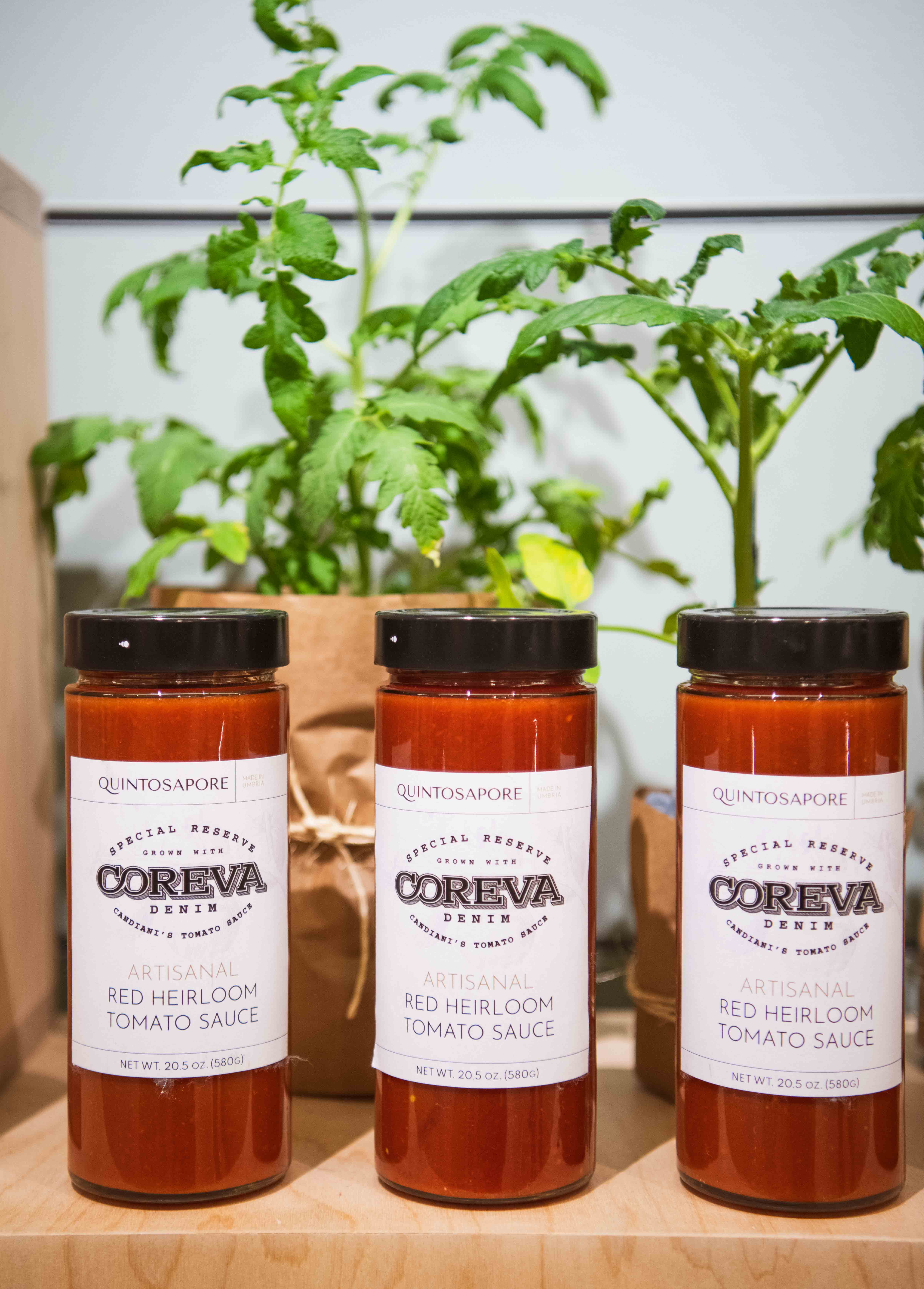 Conscious Curation is the pop-up installation that Triarchy and Bergdorf Goodman dedicated to our patented COREVA™ stretch technology and the pilot project with Quintosapore to celebrate Earth Month. The special installation features our plastic-free stretch denim, tomato plants grown with its offcuts, and the resulting tomato sauce.