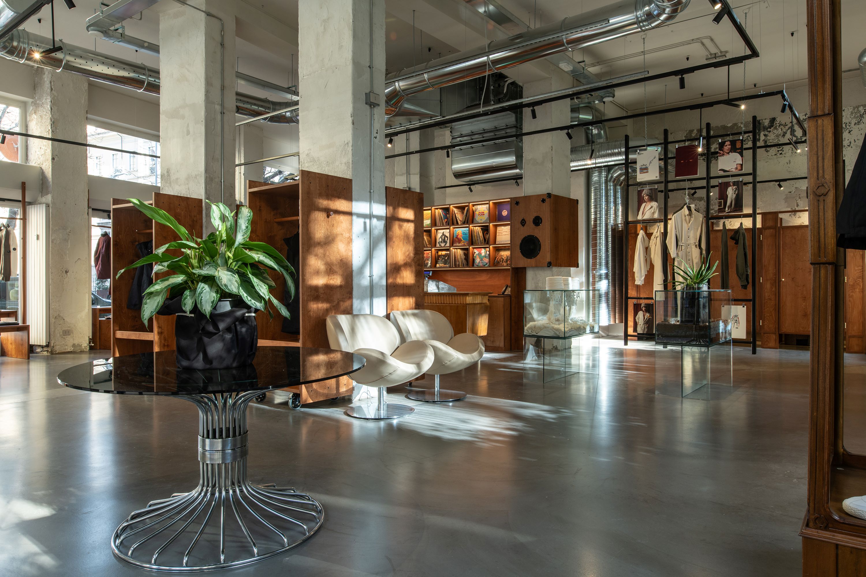 Candiani Corner was established to showcase exclusive collaborations from Candiani Denim, along with a carefully curated selection of apparel and accessories that reflect the distinctive style of La Ferramenta. The design incorporates concrete, steel, and glass, creating an industrial atmosphere. The large store windows facing Piazza Mentana connect the new space with the vitality and elegance characteristic of the Milanese neighborhood.