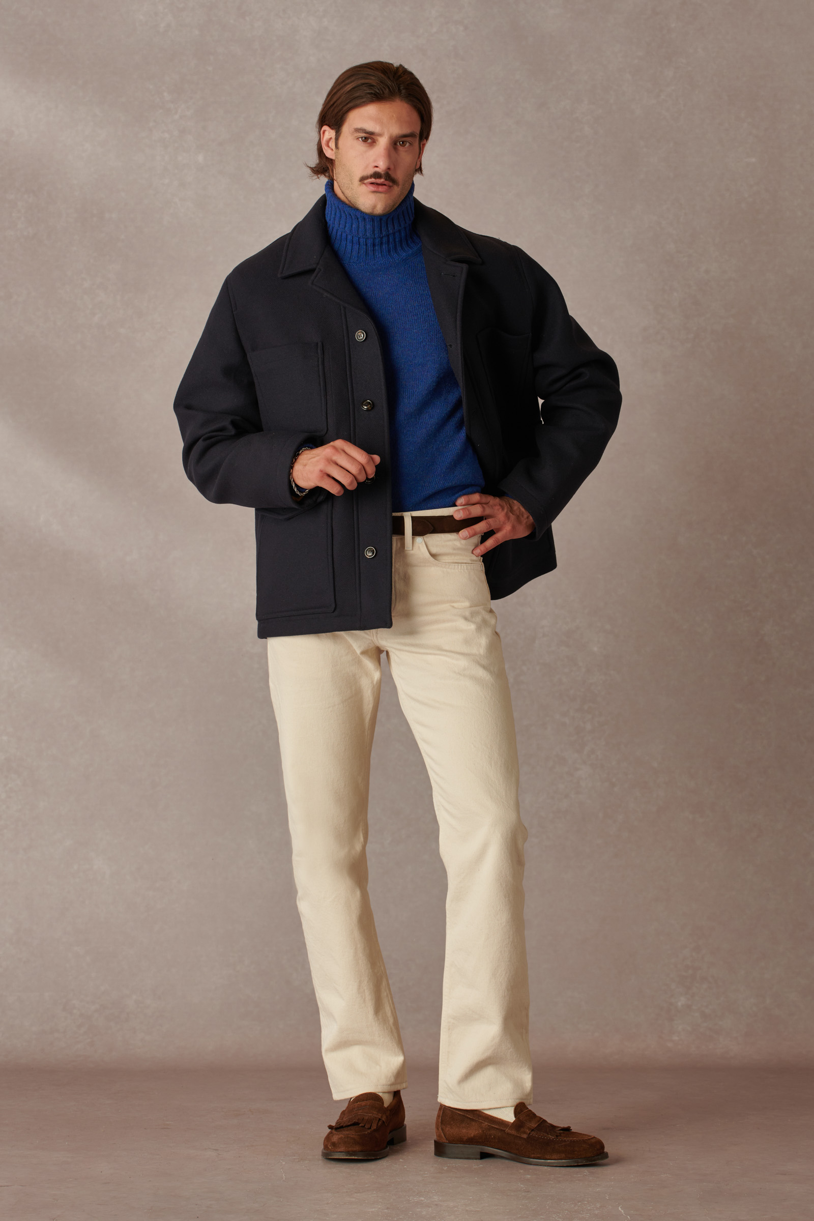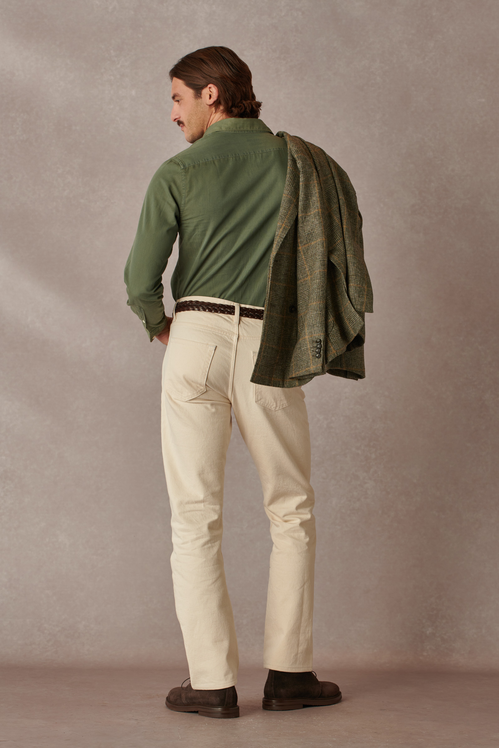 Questo classico jeans regular a cinque tasche ha una gamba che scende dritta, con una larghezza costante dall’anca alla caviglia, per offrire comfort e libertà di movimento, ma anche un aspetto equilibrato e ordinato, adatto a ogni fisicità e stile. L’écru è il colore naturale del cotone, una tonalità fresca e particolarmente amata nelle stagioni più calde, ma ormai popolare tutto l’anno. Si differenzia dal più comune jeans bianco per le impurità che restano sulla superficie e conferiscono un’immagine di naturalezza al capo.