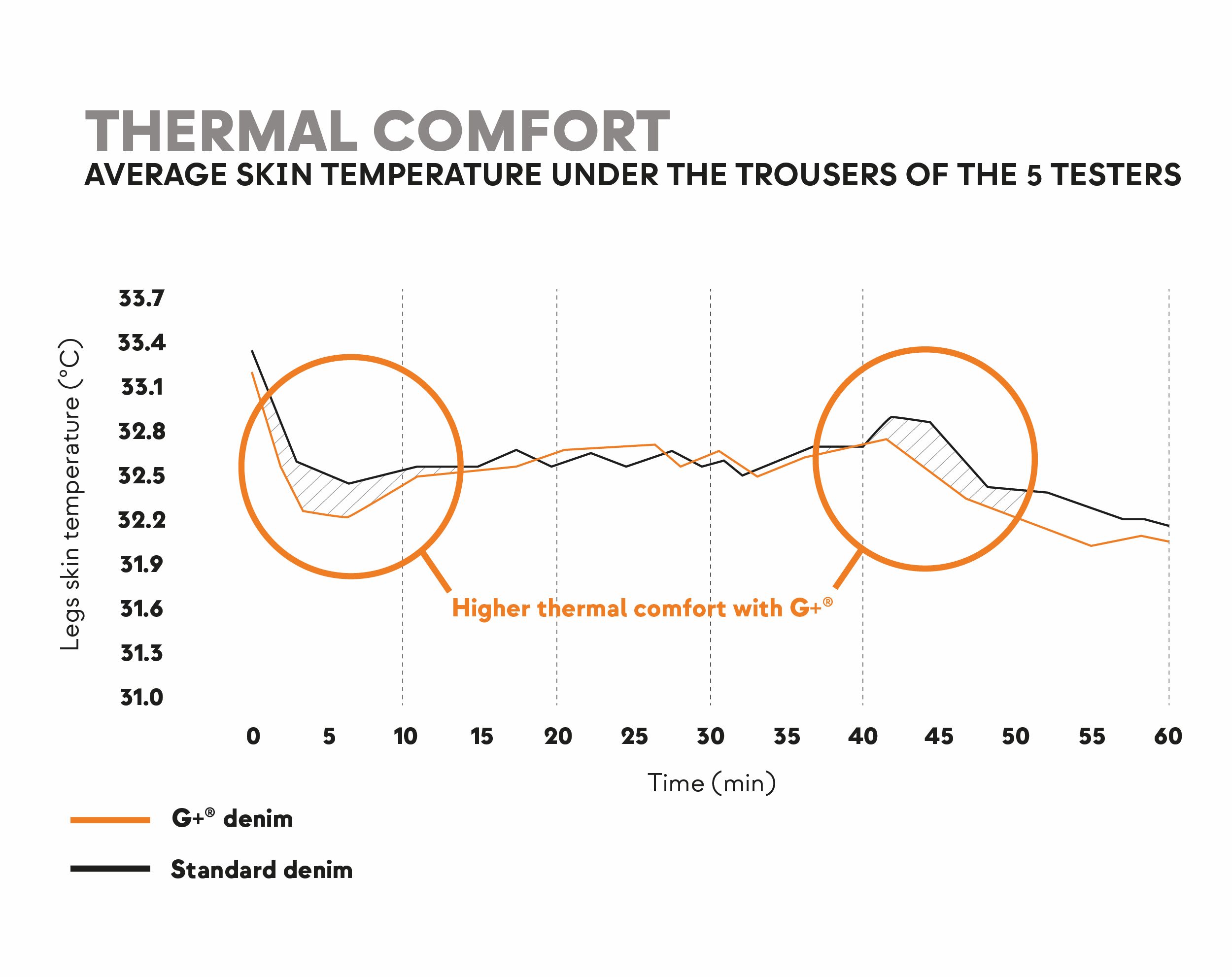 GRAPHITO assicura anche comfort termico, adattandosi a tutte le stagioni e risultando confortevole nei mesi sia caldi sia freddi. I test condotti su cinque individui di età, peso, e indice di massa corporea variabili in una camera climatica hanno mostrato una minore temperatura sulla pelle e una più alta temperatura sulla superficie esterna sui jeans trattati con G+®, indicando una migliore dissipazione del calore e un comfort termico superiore per chi li indossa.