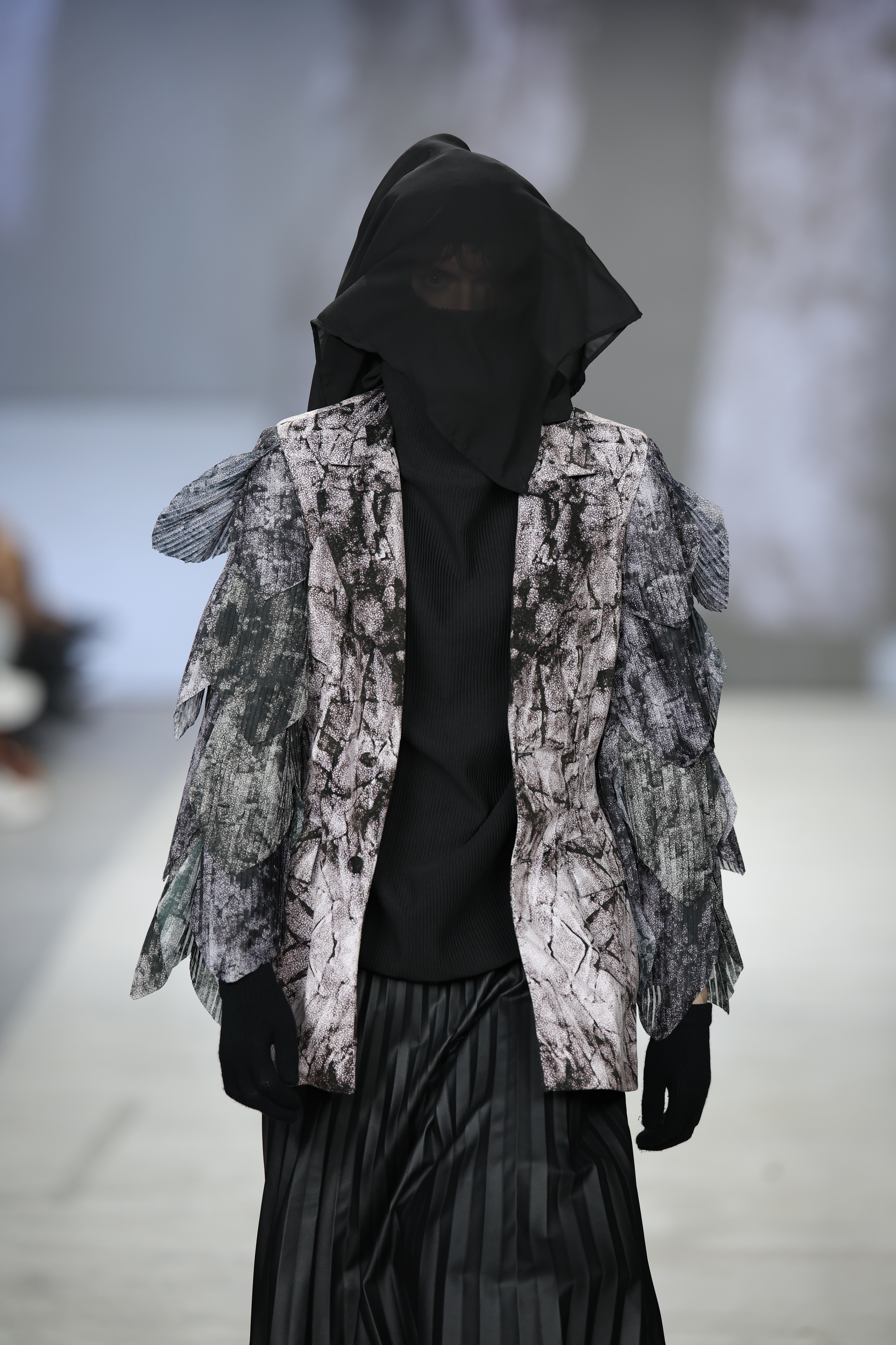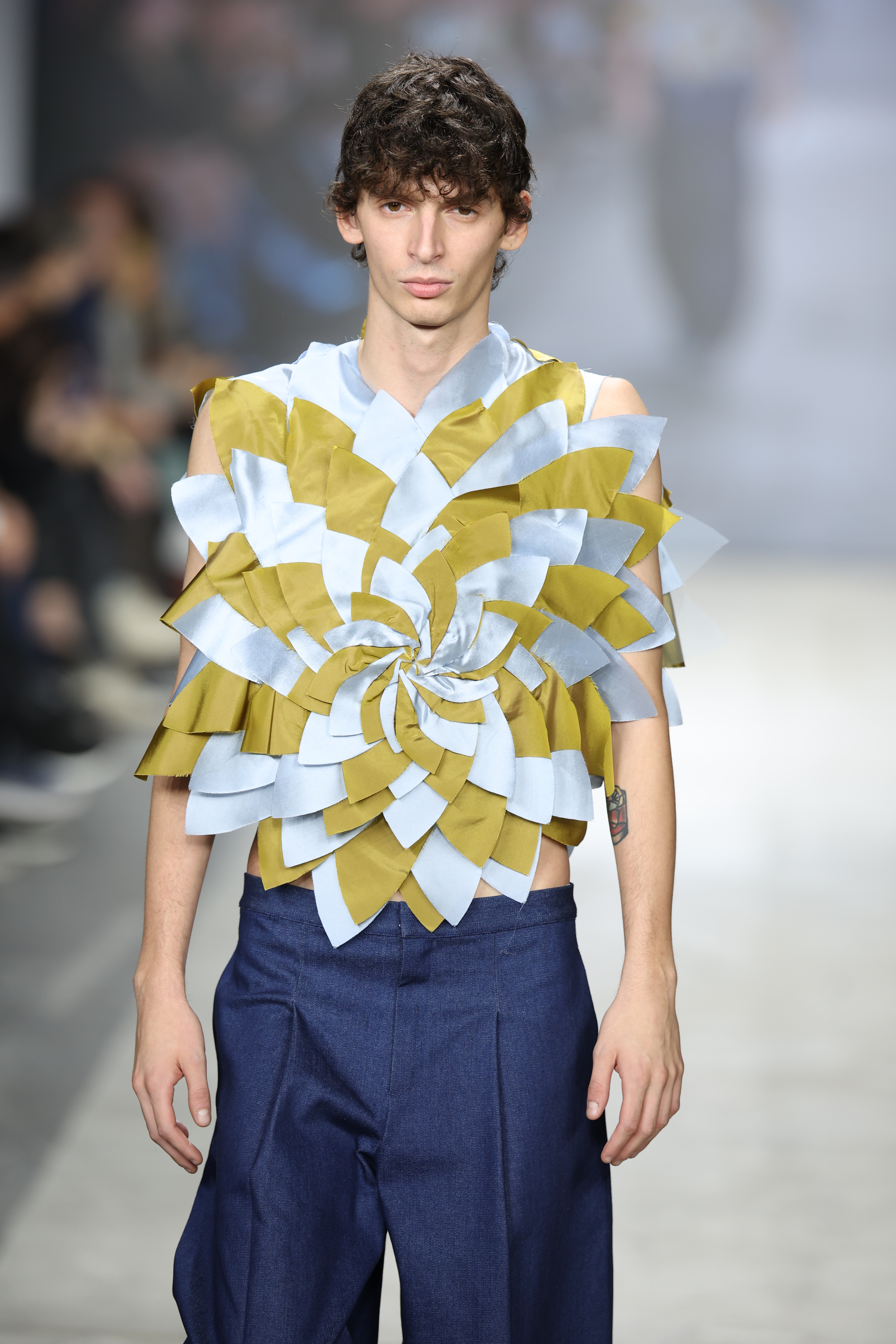 La collezione uomo di Paul Alberto Magsino si fonda sul concetto di caos legato ai nostri pensieri e alla paura di perderci tra i dubbi che si trasformano in incubi e panico e ci soffocano mentre ci impegniamo a rimanere al passo con le aspettative degli altri. I suoi capi vengono trattati come frammenti di una composizione innaturale di idee che rappresenta la distorsione causata dai pregiudizi su noi stessi, che limitano la possibilità di cambiamento e imprigionano la realtà in un insieme grottesco.