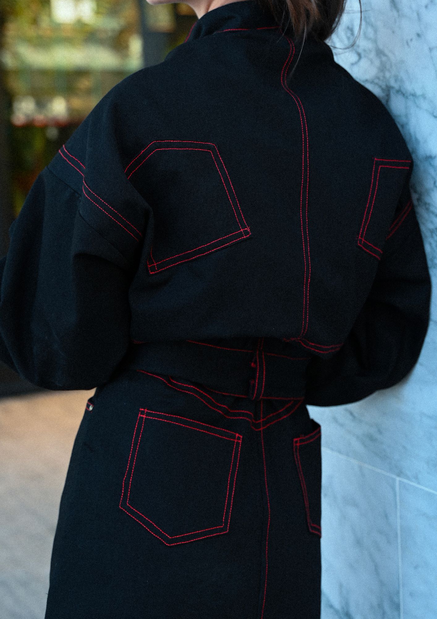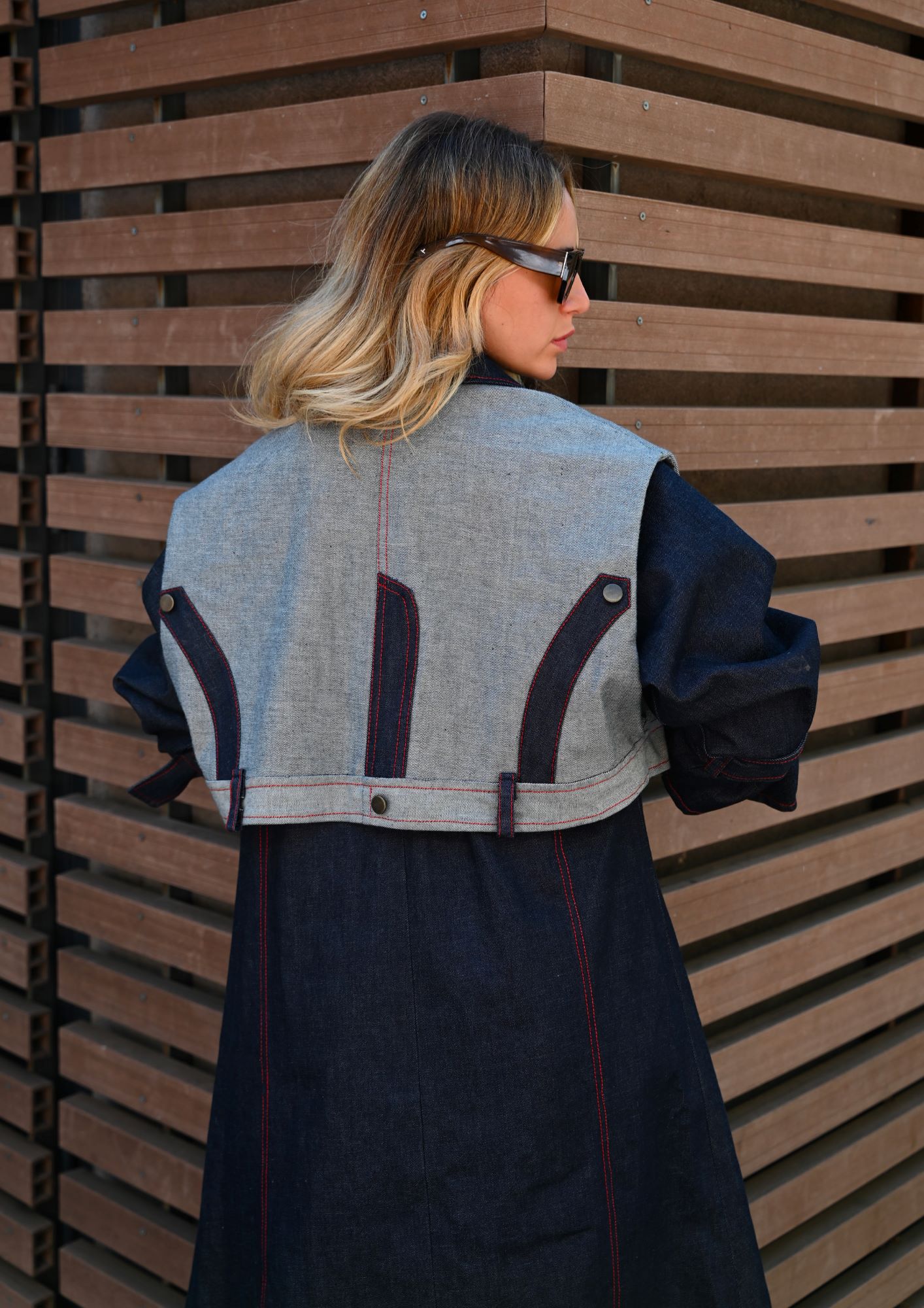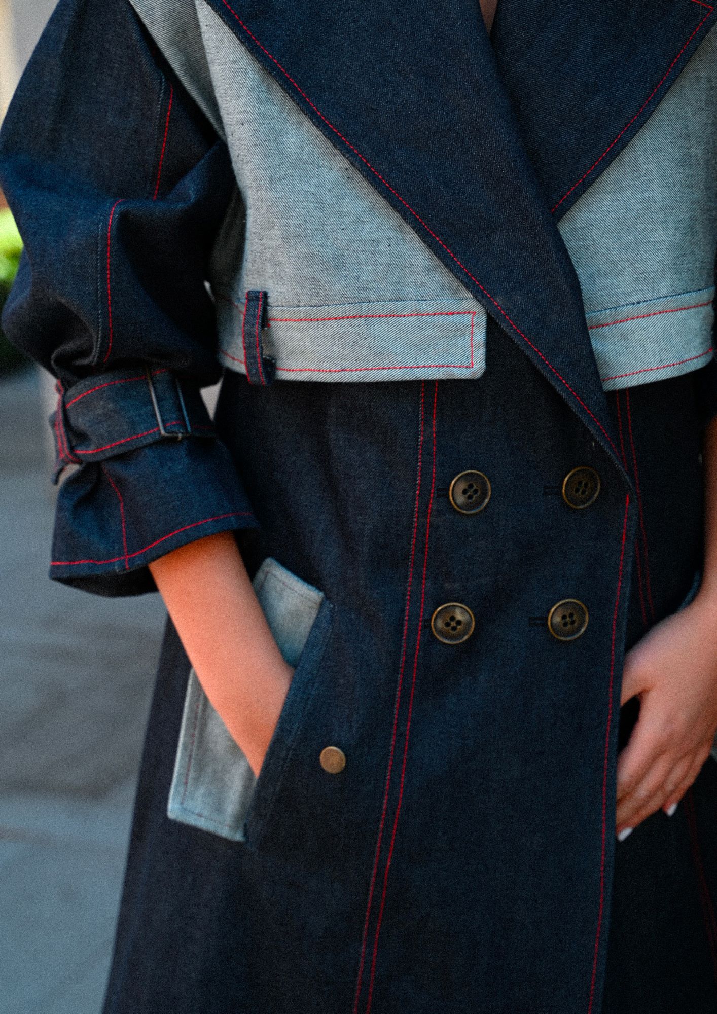 Gli altri capi hanno preso forma dal ribaltamento della funzione dell’indumento basico di partenza, ovvero il jeans, le cui caratteristiche vengono riportate nella mantella del trench e nei tagli del bomber. Infine, l’abito presenta l’enfatizzazione del colletto di una camicia e una abbottonatura asimmetrica.