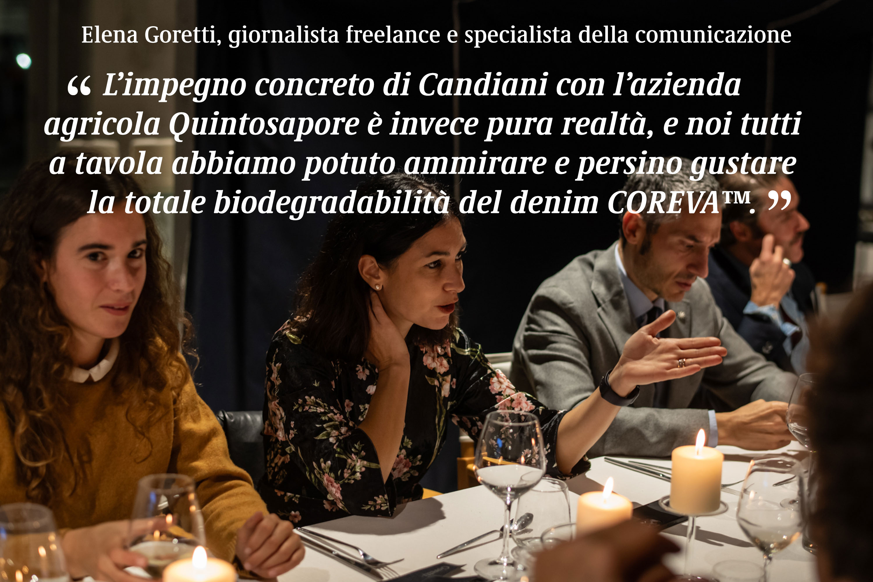 “Negli ultimi anni, ho sentito tanti parlare di economia circolare e basso impatto delle filiere produttive, ma non sempre ho potuto toccare con mano la realtà di queste iniziative. L’impegno concreto di Candiani con l’azienda agricola Quintosapore è invece pura realtà, e noi tutti a tavola abbiamo potuto ammirare e persino gustare la totale biodegradabilità del denim COREVA™. Questo significa avere davvero un'impronta zero sul suolo, sul pianeta.”